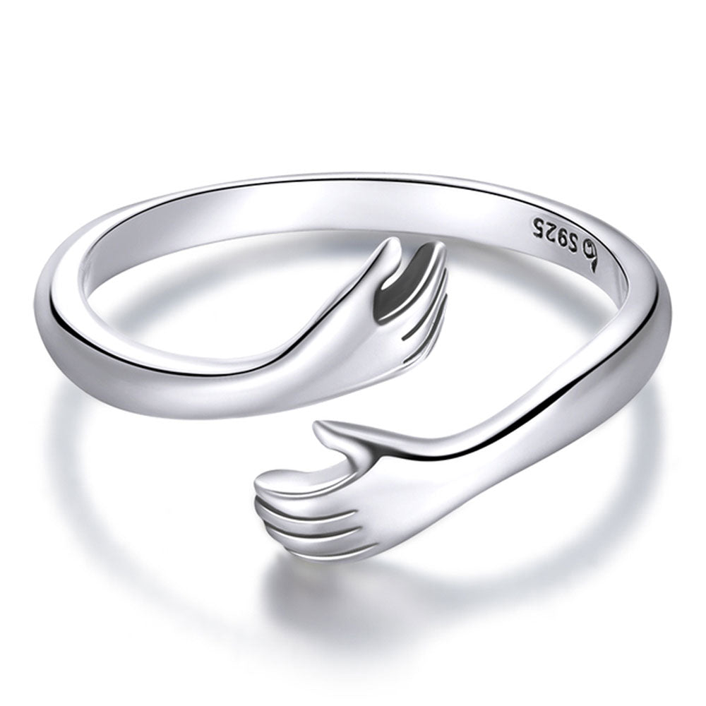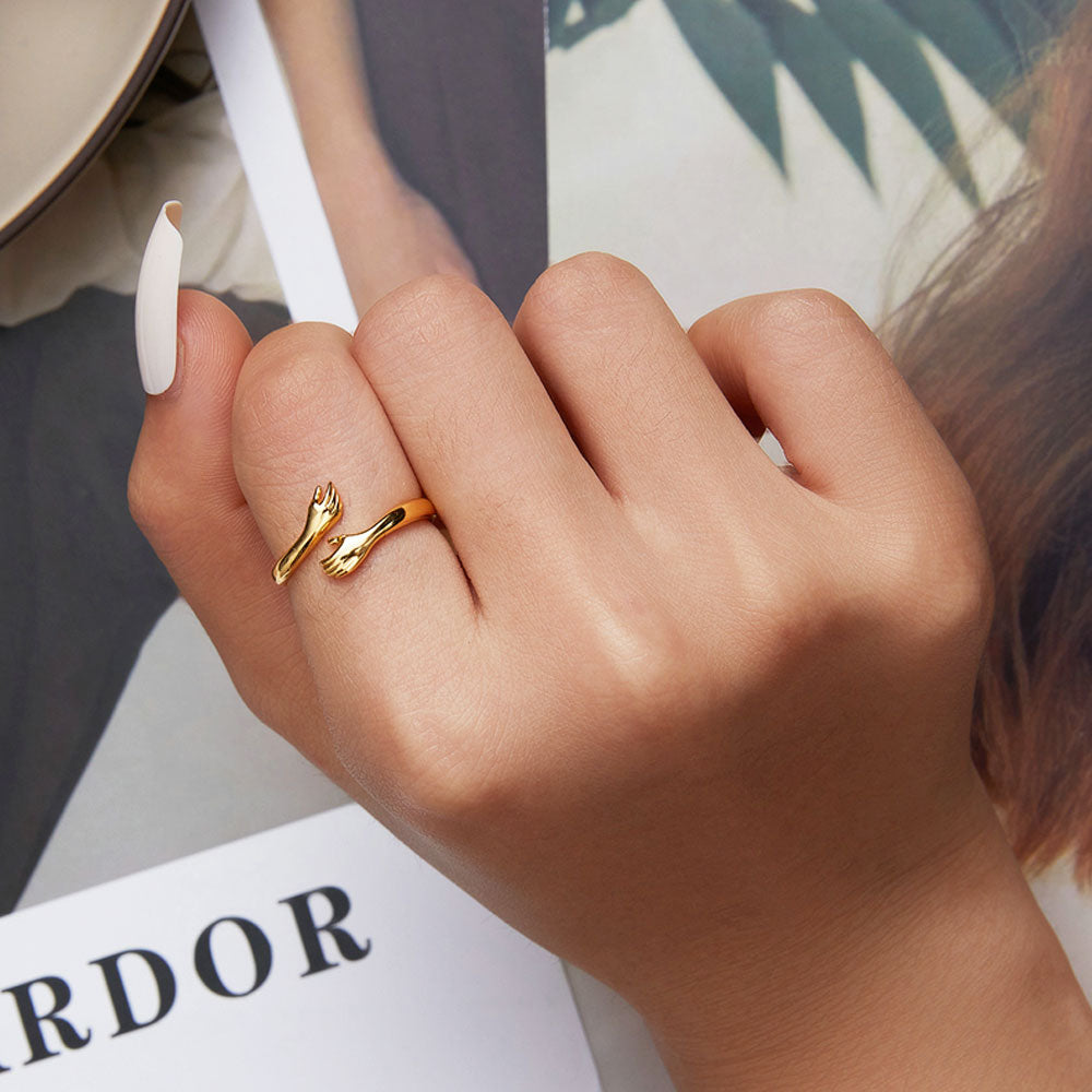このリングで、永遠の抱擁の温もりを感じてください。このユニークな作品は、永遠の抱擁をイメージして、両手があなたの指を繊細に握りしめている様子を描いています。単なるリングではなく、毎日身につけられる安らぎと愛のシンボルです。